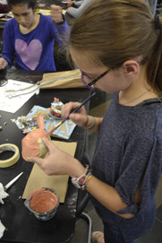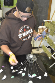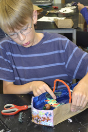 8th grade artists were challenged to create an artwork with recycled objects. Each was handed a brown lunch bag filled with random stuff...they were required to construct a hanging artwork that includes everything IN the bag AND the bag itself! The creations turned out amazingly well and are hanging in the hallway down my Ms. Brown and Mr. Eberhart's classrooms. Check them out during conferences!